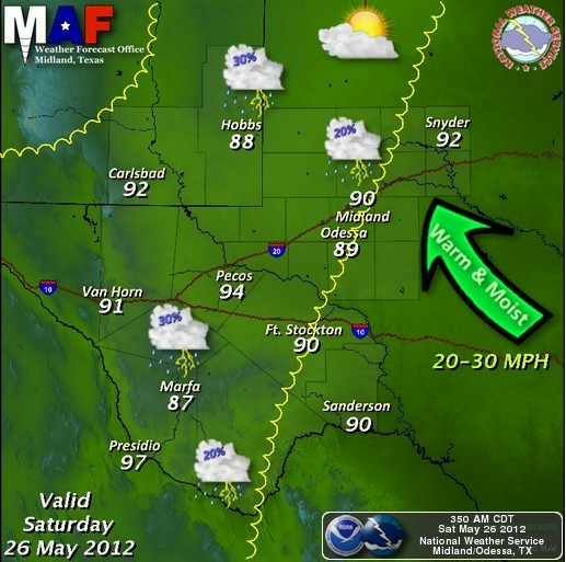 Scattered thunderstorms are forecast to develop along and east of the dryline across southeastern New Mexico and parts of west Texas this afternoon and evening. Most of us have a 20% - 30% chance of seeing measurable rainfall by tonight.