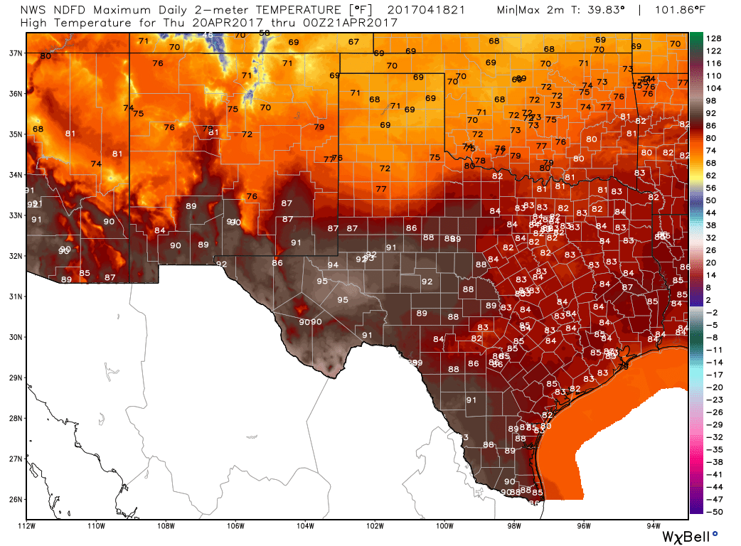 By noontime Friday the dryline gets shoved east into Central Texas. Very dry air will cover us with surface dew points in the single digits with a few dew point temperatures dropping below zero. Thus relative humidity values locally will be in the single digits. Thus killing any chances of getting wet.
