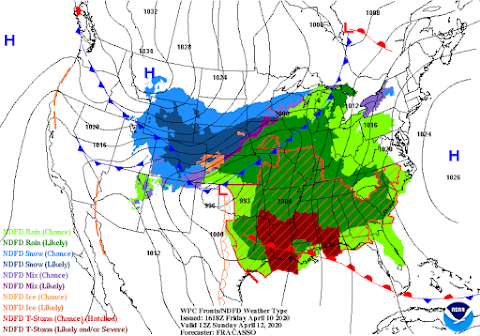 High temperatures Saturday and Easter Sunday are forecast to be in the mid to upper 70's both days locally. A few 80's may even occur in some of our normally warmer spots. Southwesterly winds gusting up to around 40 mph will spoil an otherwise beautiful holiday weekend. As was mentioned a couple of days ago the bottom falls out of the thermometer come Monday and Tuesday as a strong cold front for this time of the year plows southward down the eastern plains and into the local area on Monday. Much colder air is forecast to overspread the area behind the cold front.