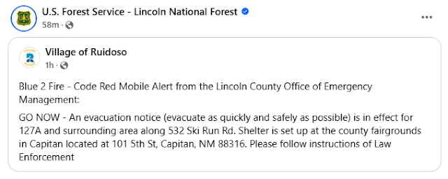 Additional evacuation orders have been issued by local authorities in Lincoln County early this Saturday morning for the following areas. 127A and surrounding areas along 532 Ski Run Rd. The Blue 2 Fire continues to spread and grow in spite of numerous fire suppression efforts yesterday including aerial slurry drops. Please heed all local evacuation orders in the affected areas.
