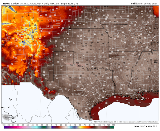 As far as southeastern New Mexico is concerned...well there is good news and not-so-good news. The good news is that our daily high temps will finally start dropping below 100F come Sunday into next week. We will see our daily highs much closer to seasonal averages with readings in the 90's next week instead of 100+.