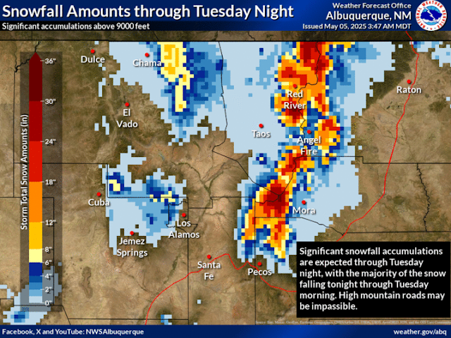A Winter Storm Warning remains in effect until 6 AM MDT Wednesday morning for the southern Sangre de Cristo mountains of northern New Mexico. Additional snowfall totals of 8" to 12" are forecast, with the higher peaks seeing 18" to 24". Road closures are likely in some areas.